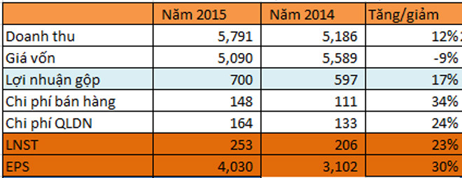 Nguyên nhân mang lại mức tăng lợi nhuận lớn hơn mức tăng doanh thu do năm 2015, giá vốn hàng bán công ty giảm mạnh 9% trong khi doanh thu thuần tăng 12%, dẫn đến lợi nhuận gộp cả năm tăng 17%. Do vậy, dù chi phí bán hàng và chi phí quản lý doanh nghiệp cũng tăng mạnh nhưng cuối quý Dabaco cũng đạt mức lợi nhuận tăng trưởng mạnh so với năm 2014. Lợi nhuận ghi nhận về cho cổ đông công ty mẹ 252,8 tỷ đồng. EPS cả năm đạt 4.030 đồng.