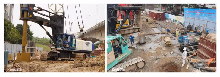 | Những ngày đầu tháng 3/2021, tại khu vực chân cầu Vĩnh Tuy, đoạn qua nút giao đường Cổ Linh (Long Biên, Hà Nội), các đơn vị nhà thầu đang tập trung nhân lực, máy khoan cỡ lớn để thi công khoan nhồi các cọc bê-tông. |