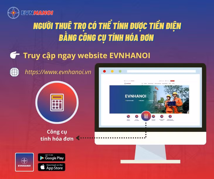 Với mong muốn nâng cao chất lượng các chương trình chăm sóc khách hàng cũng như bảo đảm mục tiêu mọi khách hàng đều có những trải nghiệm tốt nhất khi sử dụng dịch vụ điện, EVNHANOI đã cung cấp công cụ tính tiền điện trực tuyến trên trang thông tin điện tử của EVNHANOI tại địa chỉ: evnhanoi.vn