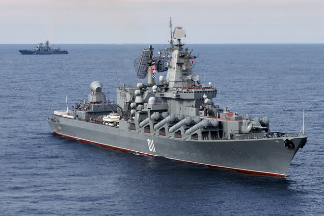 Tuần dương hạm Varyag của hạm đội Thái Bình Dương Nga. Tàu chiến này được triển khai đến Địa Trung Hải để thay thế cho tuần dương hạm tên lửa dẫn đường Moskva tuần tra vùng biển ngoài khơi Syria. Ảnh: TASS.