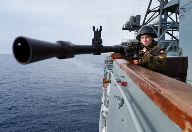Một binh sĩ hải quân Nga trên boong tàu Phó Đô đốc Kulakov ngoài khơi Syria. Ảnh: TASS.