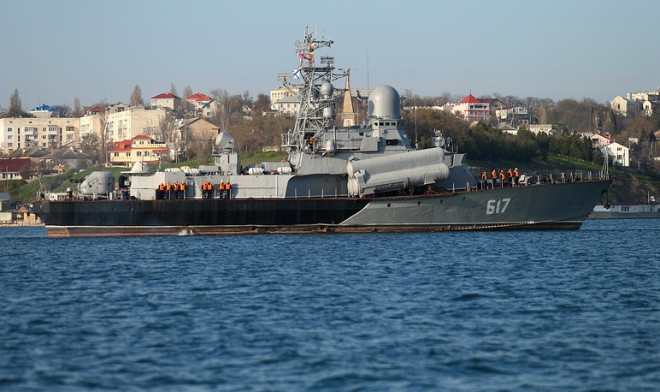 Trước đó một ngày, hai tàu tên lửa cỡ nhỏ khác cùng Hạm đội Biển Đen là Serpukhov và Zelyony Dol trang bị tên lửa hành trình Kalibr đã rời Sevastopol để tới Địa Trung Hải, tham gia đội tàu chiến Nga tham chiến tại Syria. Trên ảnh là tàu tên lửa Serpukhov trước khi xuất phát. Ảnh: TASS.