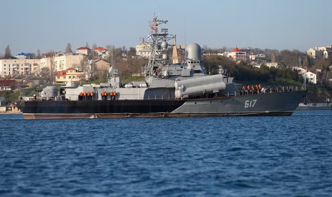 àu tên lửa cỡ nhỏ Mirazh thuộc Hạm đội Biển Đen rời cảng Sevastopol hôm 6/7 để lên đường đến tham chiến ở Syria. Tàu này trang bị tên lửa hành trình chống tàu Malakhit, hệ thống tên lửa phòng không Osa-M và pháo hạm. Ảnh: TASS.