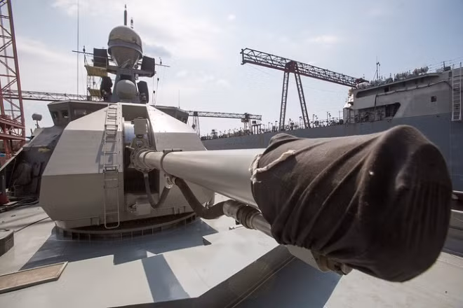 Một hệ thống pháo trên tàu tên lửa Zelyony Dol. Tàu chiến này và tàu Serpukhov từng phóng tên lửa hành trình Kalibr diệt nhóm phiến quân Jabhat al-Nusra ở Syria hồi giữa tháng 8. Ảnh: TASS.