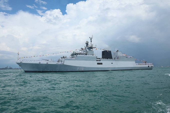 Tàu hộ vệ INS Komarta (P28) của Ấn Độ neo đậu ở căn cứ Changi. Đây là chiếc đầu tiên trong dự án tàu tàng hình chống ngầm hiện đại nhất của hải quân Ấn Độ.