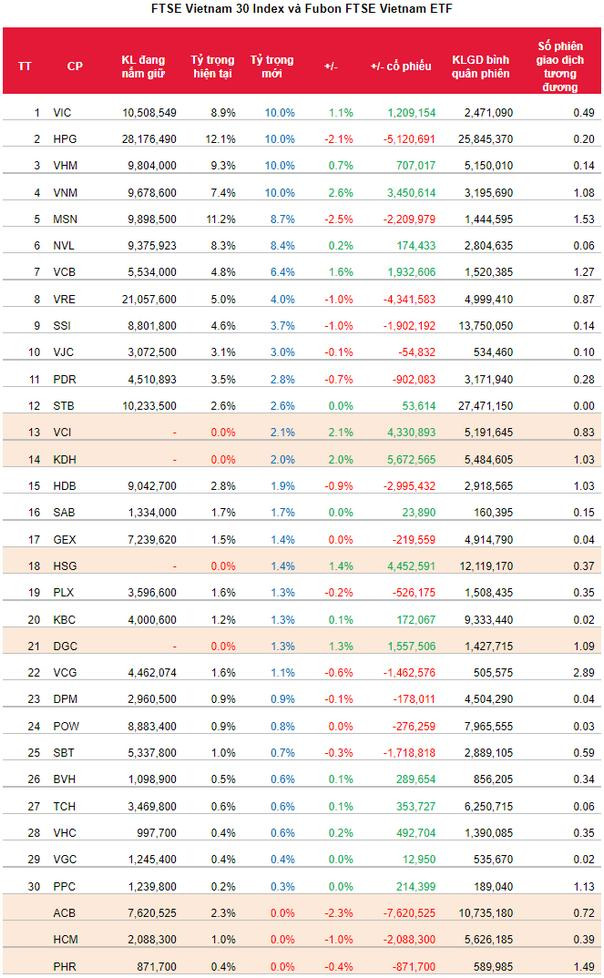 Ngoài ra, chỉ số FTSE Vietnam 30 Index (chỉ số cơ sở cho quỹ Fubon FTSE Vietnam ETF) cũng thực hiện tái cơ cấu danh mục lần đầu tiên kể từ khi thành lập quỹ. Theo quy tắc quản lý, chỉ số được rà soát định kỳ vào tháng 3 và tháng 9 hàng năm.