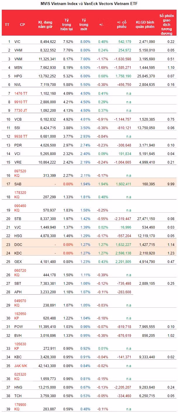 Với giả định thêm mới 3 cổ phiếu trên, danh mục V.N.M ETF sẽ bao gồm 39 cổ phiếu, trong đó có 25 cổ phiếu niêm yết tại Việt Nam và 14 cổ phiếu nước ngoài có liên quan.