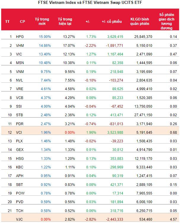 Giả định thêm mới VCI và loại VJC, danh mục FTSE ETF sẽ bao gồm 21 cổ phiếu. Tổng tài sản quỹ tại ngày 13/8 đạt 448 triệu USD (10.230 tỷ đồng). SSI Research ước tính VCI sẽ được thêm vào với tỷ trọng 1,96%, tương đương khối lượng 3,5 triệu cổ phiếu. Ngược lại, VJC có thể bị bán toàn bộ 2,4 triệu cổ phiếu.