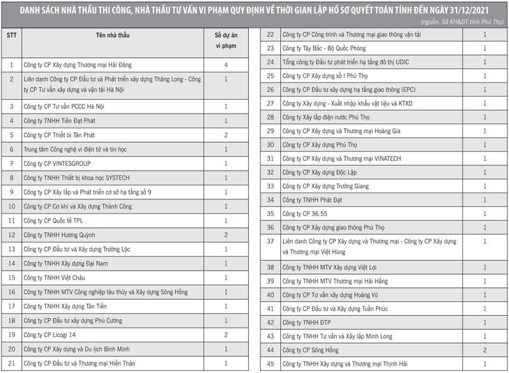 Làm rõ thông tin về các nhà thầu vi phạm, một cán bộ Phòng Đầu tư thuộc Sở Tài chính tỉnh Phú Thọ - đơn vị đề xuất danh sách trên, cho biết: “Danh sách 45 nhà thầu vi phạm được Sở Tài chính tỉnh Phú Thọ tổng hợp trên cơ sở báo cáo, kiến nghị của chủ đầu tư các dự án trên địa bàn Tỉnh gửi về”. Theo cán bộ này, việc nhà thầu vi phạm quy định thời gian lập hồ sơ quyết toán hợp đồng có thể ảnh hưởng đến tiến độ quyết toán dự án hoàn thành.