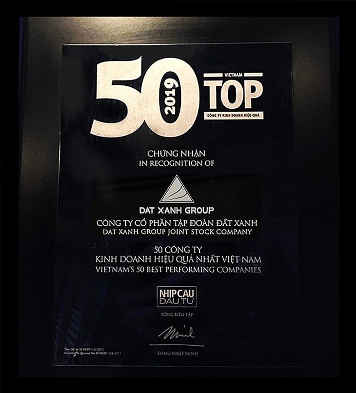 Chứng nhận của Đất Xanh đạt Top 50 Công ty kinh doanh hiệu quả nhất Việt Nam