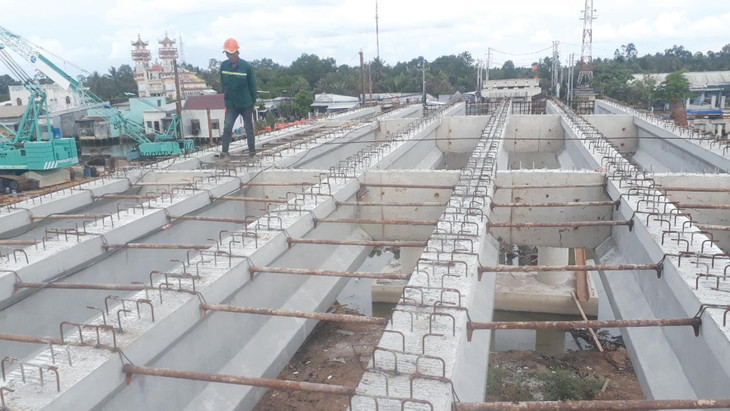 Hiện tại, Nhà thầu đang thi công trụ cầu T2-2 trên cống giai đoạn 1 bờ Hưng Yên và sẽ tiến hành gác dầm đầu tháng 5/2021 nhịp cầu TD5 - T2-2.