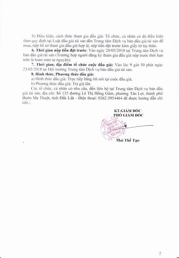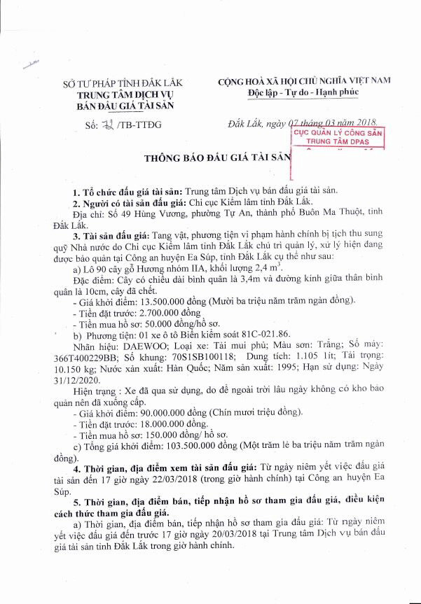(BĐT) - Trung tâm dịch vụ bán đấu giá tài sản tỉnh Đắk Lắk thông báo bán đấu giá tài sản do Chi cục Kiểm lâm tỉnh Đắk Lắk ủy quyền như sau: