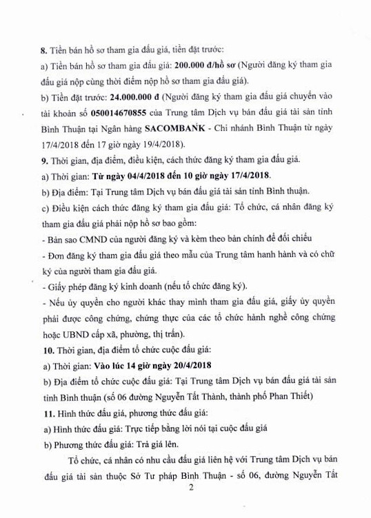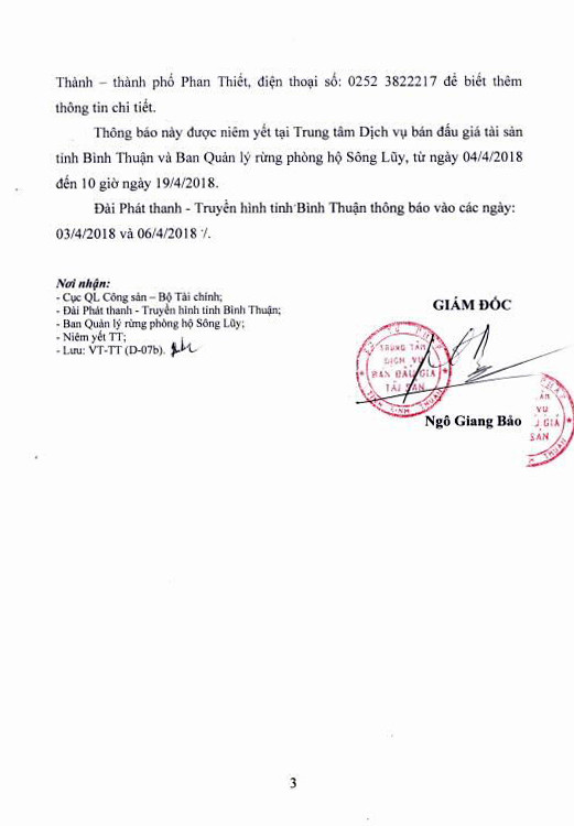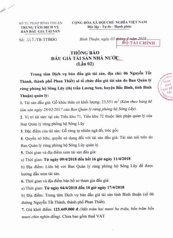 (BĐT) - Trung tâm Dịch vụ bán đấu giá tài sản tỉnh Bình Thuận thông báo bán đấu giá tài sản do Ban Quản lý rừng phòng hộ Sông Lũy ủy quyền như sau: