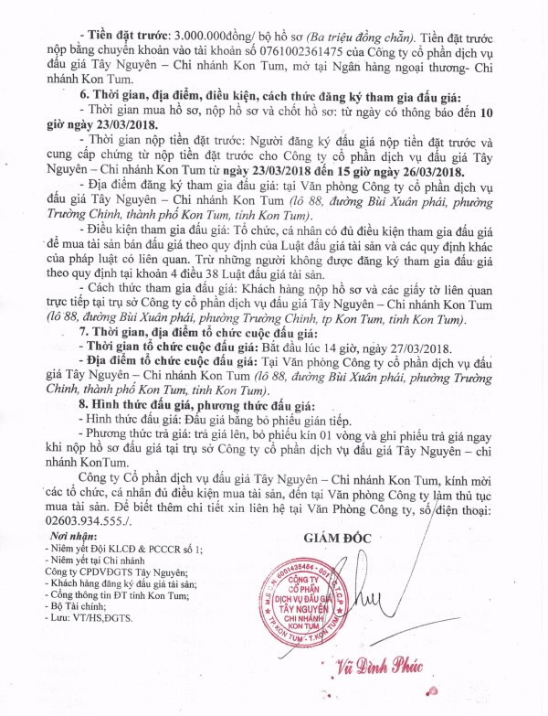 (BĐT) - Công ty cổ phần dịch vụ đấu giá Tây Nguyên CN Kon Tum thông báo bán đấu giá tài sản do Đội KLCĐ&PCCCR ủy quyền như sau: