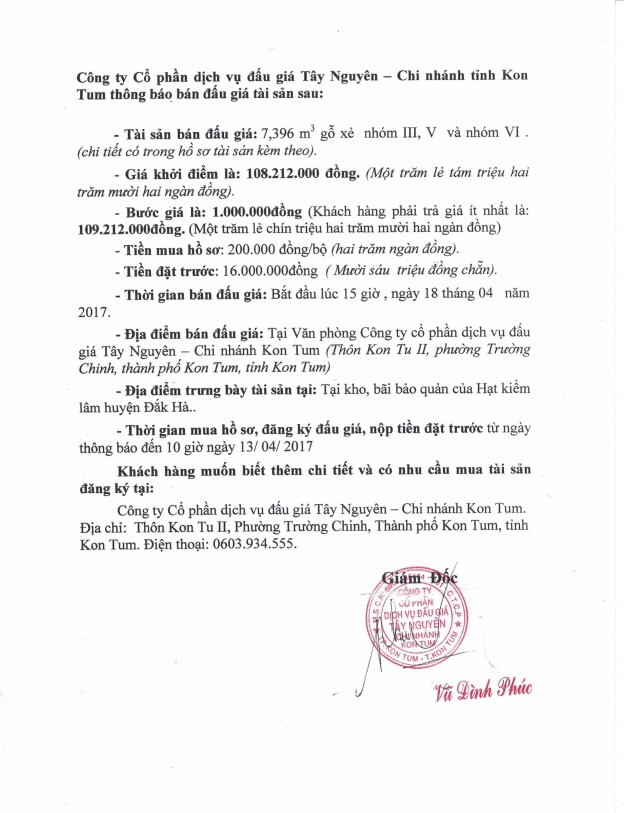 (BĐT) - Công ty Cổ phần dịch vụ đấu giá Tây Nguyên – Chi nhánh tỉnh Kon Tum thông báo bán đấu giá tài sản như sau: