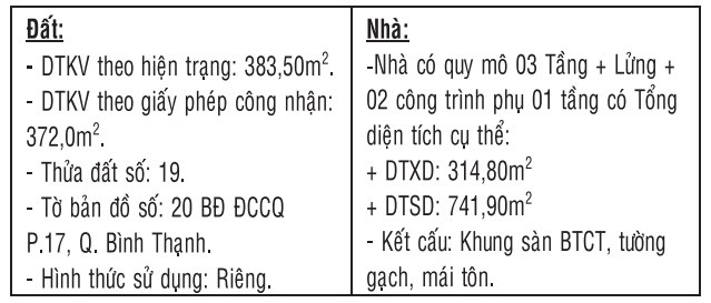 1. Tài sản bán đấu giá: Nhà và đất tại địa chỉ số 236/14F (số cũ 106/10) Đường Điện Biên Phủ, Phường 17, quận Bình Thạnh, Thành phố Hồ Chí Minh được cấp theo Giấy phép công nhận Quyền sở hữu nhà số 6080/GP-UB do Ủy ban nhân dân quận Bình Thạnh cấp ngày 02/12/1992. Hiện trạng thực tế theo bản vẽ hiện trạng của Công ty TNHH Tư vấn Thiết kế xây dựng & Đo đạc Kiến Ốc lập ngày 25/05/2016 đã được Trưởng phòng Quản lý đô thị quận Bình Thạnh xác nhận ngày 29/08/2016, cụ thể như sau:
