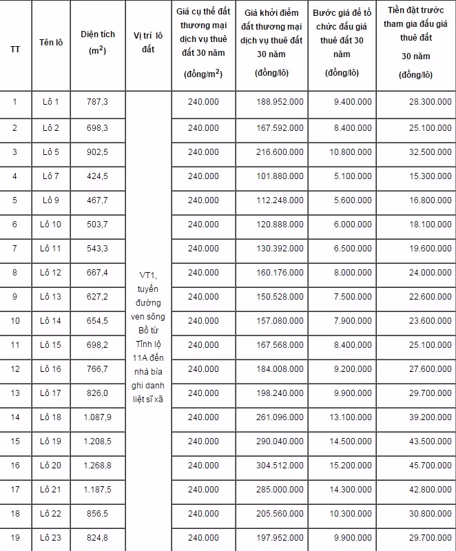 II. Mức giá tối thiểu, tiền đặt trước, bước giá của từng lô đất