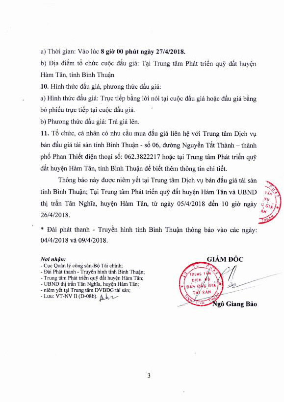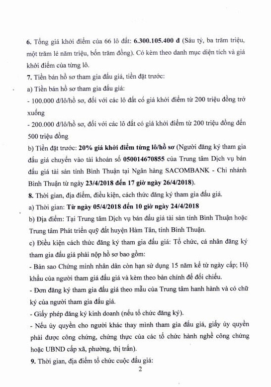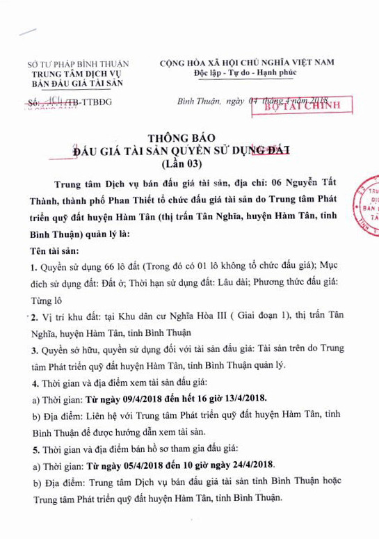 (BĐT) - Trung tâm Dịch vụ bán đấu giá tài sản tỉnh Bình Thuận thông báo bán đấu giá tài sản do Trung tâm Phát triển quỹ đất huyện Hàm Tân ủy quyền như sau: