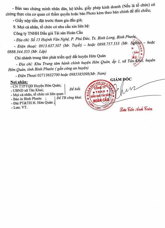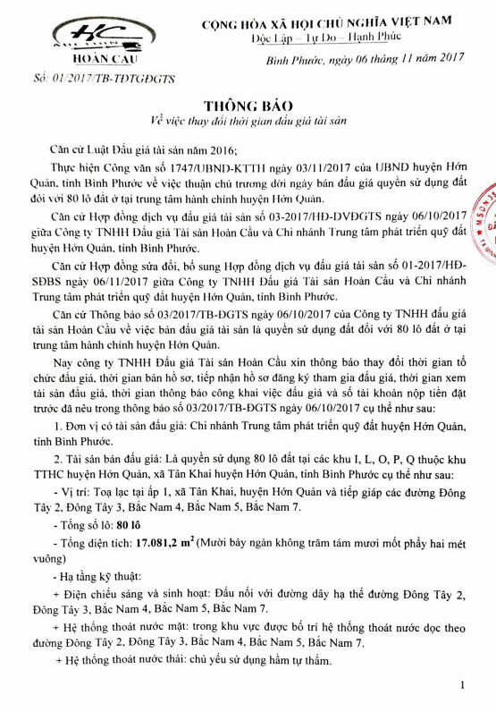 (BĐT) - Công ty TNHH đấu giá tài sản Hoàn Cầu thông báo bán đấu giá tài sản do Chi nhánh Trung tâm phát triển quỹ đất huyện Hớn Quảng ủy quyền như sau: