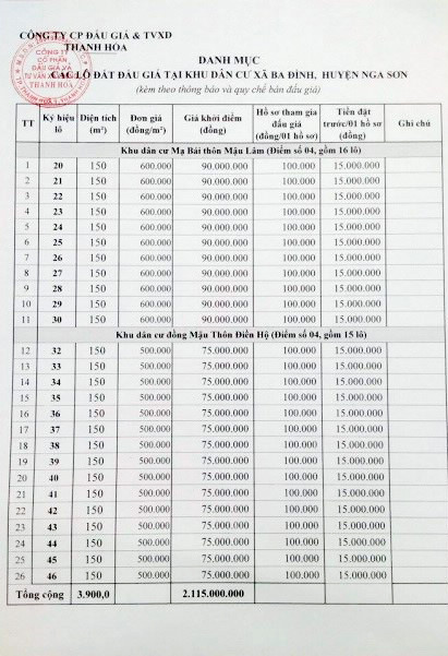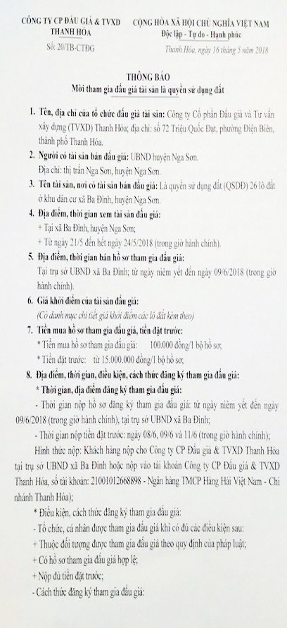 (BĐT) - Công ty Cổ phần đấu giá & TVXD Thanh Hóa thông báo bán đấu giá tài sản do UBND huyện Nga Sơn ủy quyền như sau: