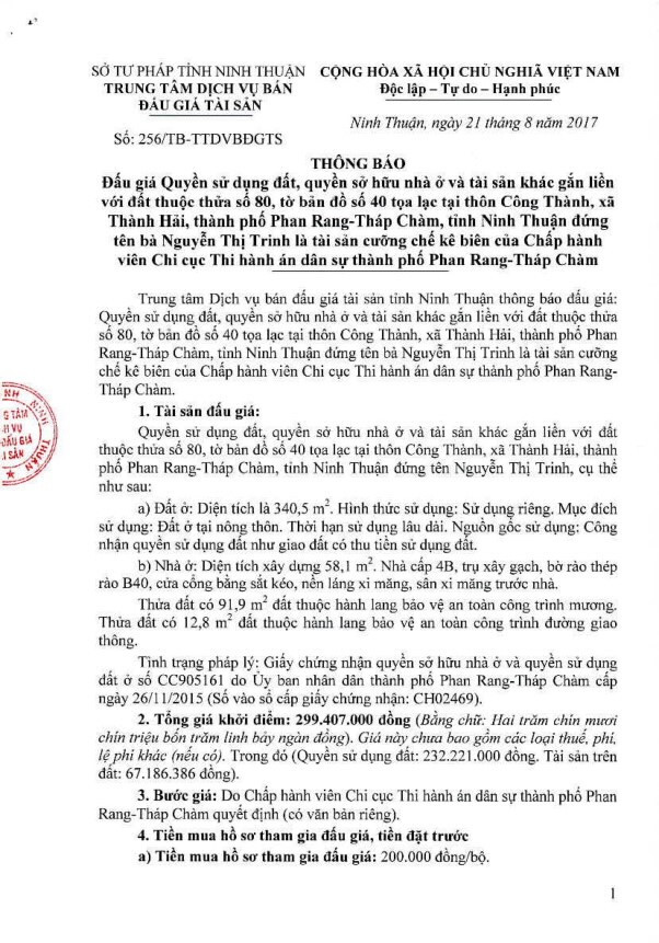 (BĐT) - Trung tâm dịch vụ bán đấu giá tài sản tỉnh Ninh Thuận thông báo bán đấu giá tài sản như sau: