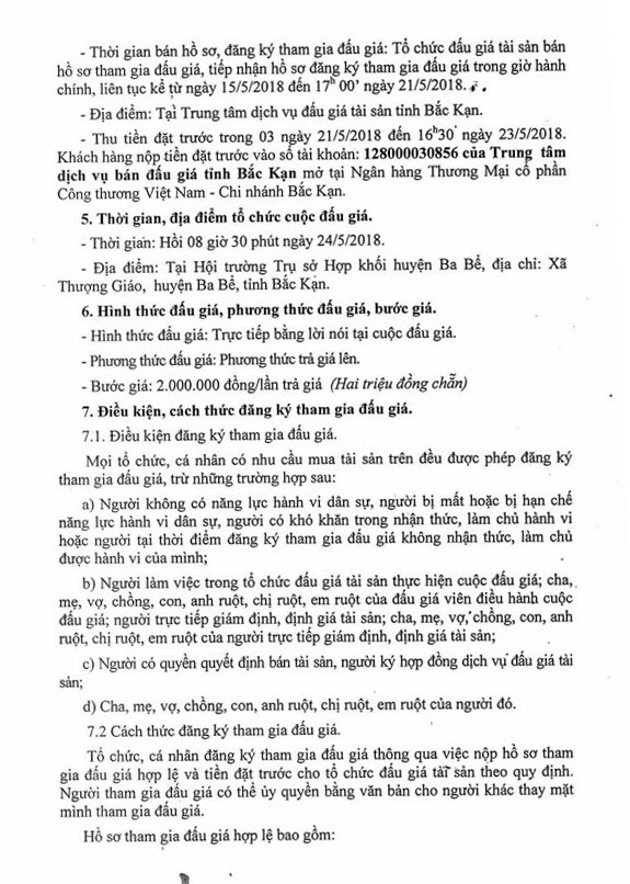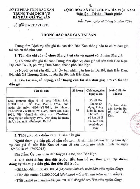 (BĐT) - Trung tâm dịch vụ bán đấu giá tài sản - Sở Tư pháp tỉnh Bắc Kạn thông báo bán đấu giá tài sản do ủy ban nhân dân huyện Ba Bể, Bắc Kạn ủy quyền như sau: