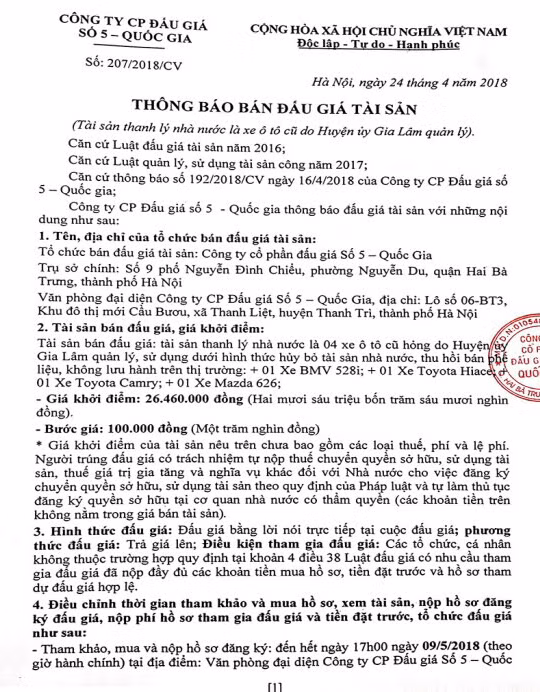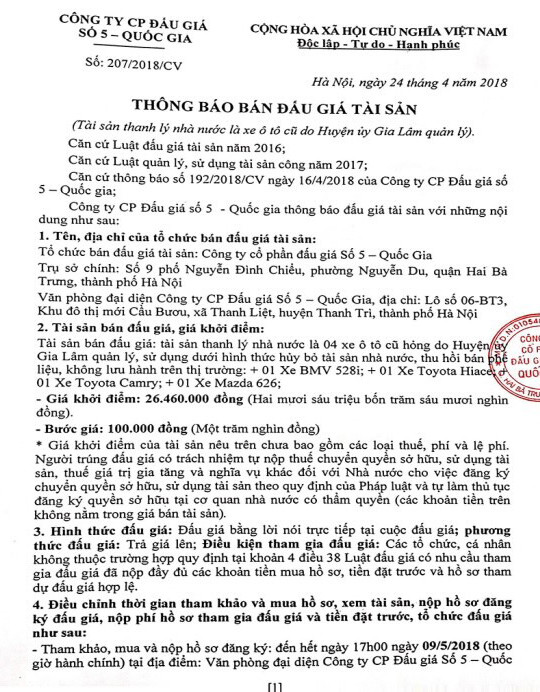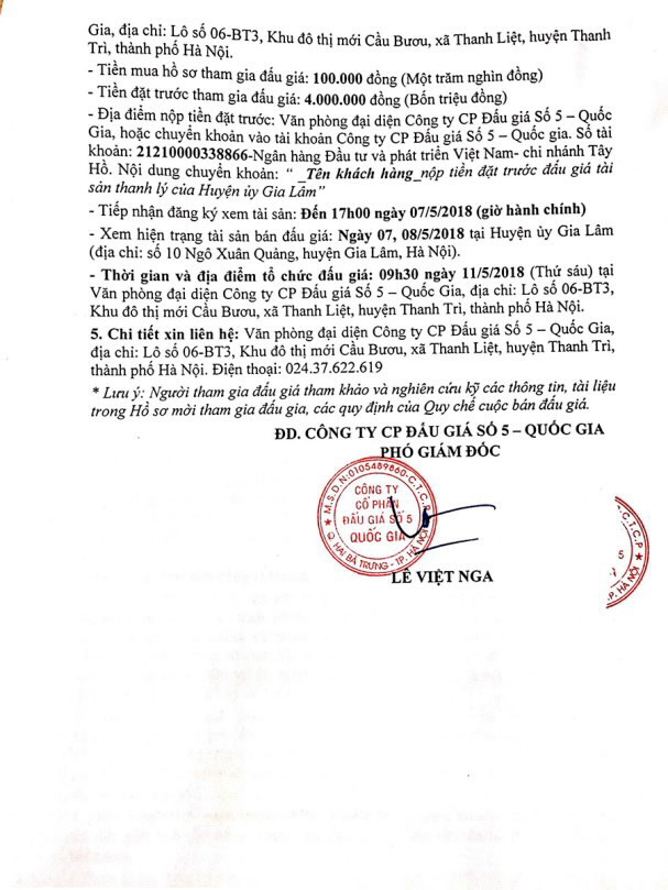 (BĐT) - Công ty CP đấu giá số 5 Quốc gia thông báo bán đấu giá tài sản do Huyện ủy Gia Lâm ủy quyền như sau: