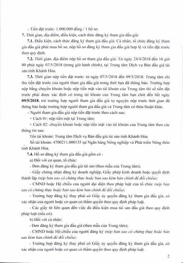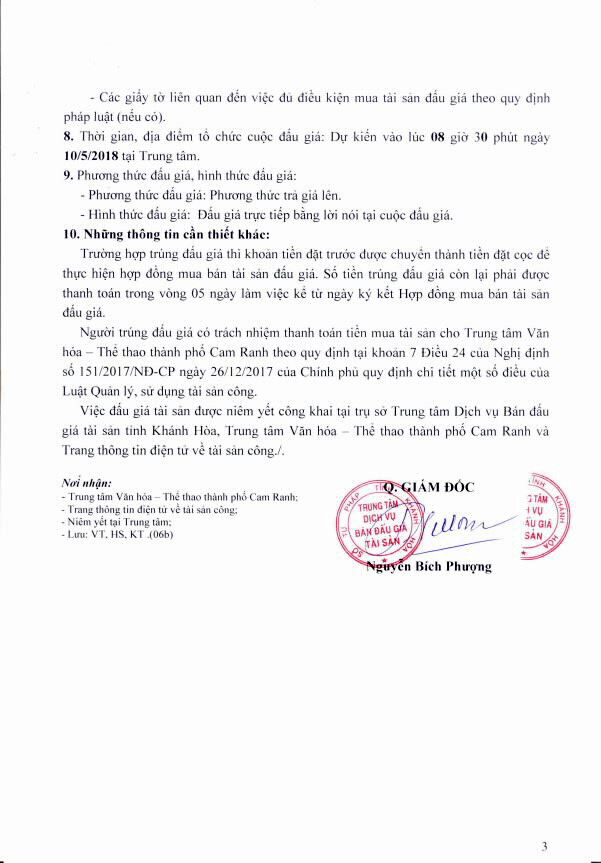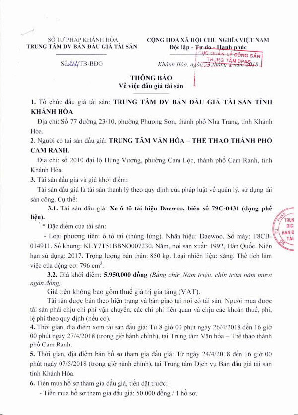 (BĐT) - Trung tâm dịch vụ bán đấu giá tài sản tỉnh Khánh Hoà thông báo bán đấu giá tài sản do Trung tâm Văn hóa – Thể thao thành phố Cam Ranh ủy quyền như sau:
