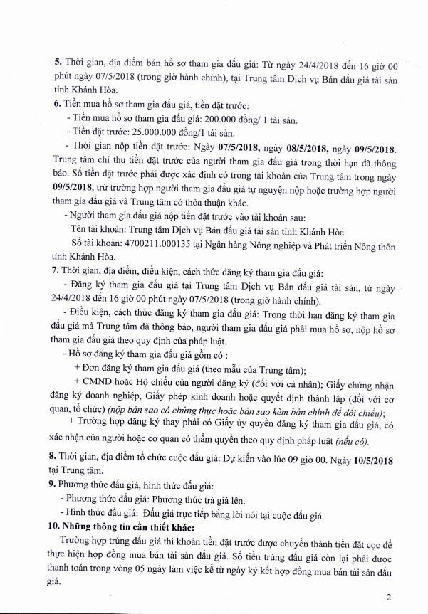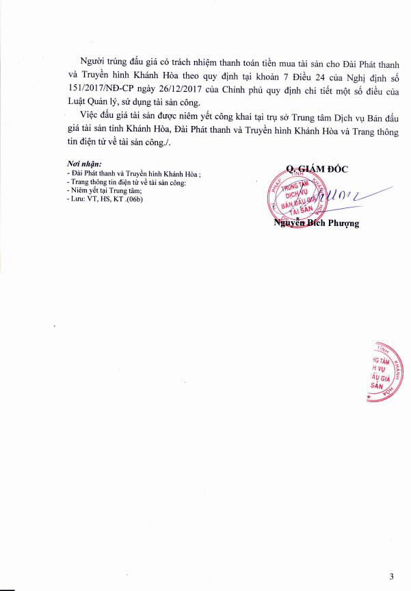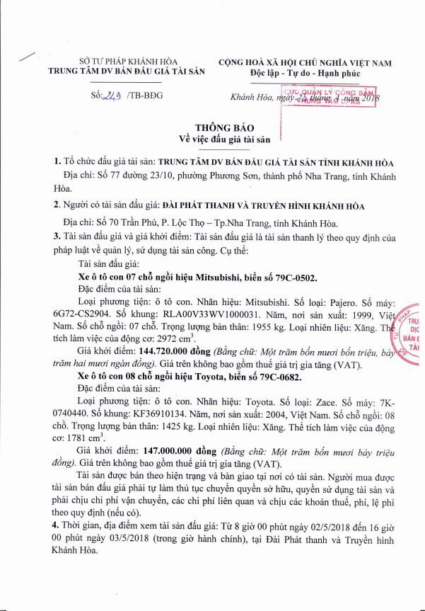 (BĐT) - Trung tâm dịch vụ bán đấu giá tài sản tỉnh Khánh Hoà thông báo bán đấu giá tài sản do Đài Phát thanh và Truyền hình Khánh Hòa ủy quyền như sau: