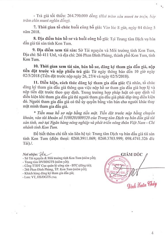 (BĐT) - Trung tâm dịch vụ bán đấu giá tài sản tỉnh Kon Tum thông báo bán đấu giá tài sản do Sở Tài nguyên & Môi trường tỉnh Kon Tum ủy quyền như sau: