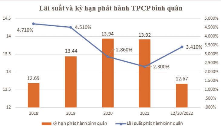 Theo thống kê, 5 năm trở lại đây, kỳ hạn TPCP bình quân dao động từ 12-14 năm, tạo độ trễ an toàn cho áp lực thanh toán gốc trái phiếu. Tuy nhiên, lãi suất Chính phủ phải trả trên thị trường đấu thầu TPCP có sự biến động đáng chú ý. Năm 2018, lãi suất bình quân TPCP là 4,71%/năm; năm 2019 là 4,51%/năm; năm 2020 giảm về 2,86%/năm; năm 2021 giảm về 2,3%/năm, nhưng năm 2022 lại tăng nhanh lên mức 3,41%/năm.