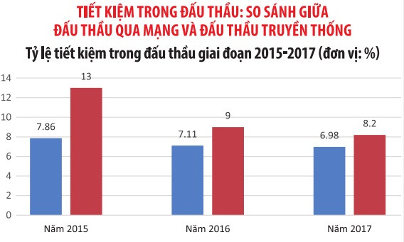 Đã có tổng cộng hơn 16.000 gói thầu trên cả nước áp dụng đấu thầu qua mạng, trong đó: Giai đoạn 2010 - 2015: 2.073 gói; năm 2016: 3.327 gói (tổng giá trị 3.020 tỷ đồng); năm 2017: 8.200 gói (tổng giá trị 12.000 tỷ đồng); quý I/2018: 2.400 gói.