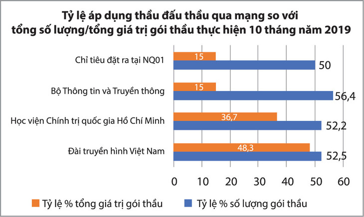 Về phía các bộ, ngành, số liệu được Bộ KH&ĐT vừa công bố cho thấy, có 3 trong số 37 đơn vị được thống kê đã đạt/vượt chỉ tiêu cả năm như: Đài Truyền hình Việt Nam (đạt 52,5% về số lượng gói thầu và 48,3% về tổng giá trị gói thầu thực hiện ĐTQM); Học viện Chính trị quốc gia Hồ Chí Minh (tương ứng đạt 52,2% và 36,7%); Bộ Thông tin và Truyền thông (đạt 56,4% và 15%). Có 8 đơn vị đạt chỉ tiêu về tổng giá trị gói thầu (từ 15,4% đến 38,2%) nhưng chưa đạt chỉ tiêu về số lượng gói thầu (dưới 50%). Và có đến 21 đơn vị có tổng giá trị các gói thầu ĐTQM đạt dưới 10%; 32 đơn vị có số lượng gói thầu lựa chọn nhà thầu qua mạng đạt dưới 40%. Thậm chí, có 7 đơn vị chưa thực hiện ĐTQM gói thầu nào.