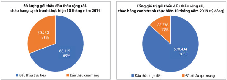 Theo KH&ĐT, trong 10 tháng đầu năm 2019, cả nước có 30.250 gói thầu được ĐTQM (chiếm 30,8% tổng số gói thầu đã thực hiện) với tổng giá trị gói thầu là 88.336 tỷ đồng (chiếm 13,4% tổng giá trị các gói thầu đã thực hiện). Kết quả này chưa đạt so với chỉ tiêu đặt ra trong NQ 01 là tỷ lệ lựa chọn nhà thầu qua mạng bằng hình thức chào hàng cạnh tranh, đấu thầu rộng rãi đạt tối thiểu 50% về số lượng gói thầu và 15% về tổng giá trị gói thầu.Và mặc dù chỉ còn 2 tháng nữa là kết thúc năm 2019 song vẫn còn nhiều bộ, ngành, địa phương, tập đoàn kinh tế, tổng công ty nhà nước chưa hoàn thành chỉ tiêu đặt ra tại Nghị quyết.