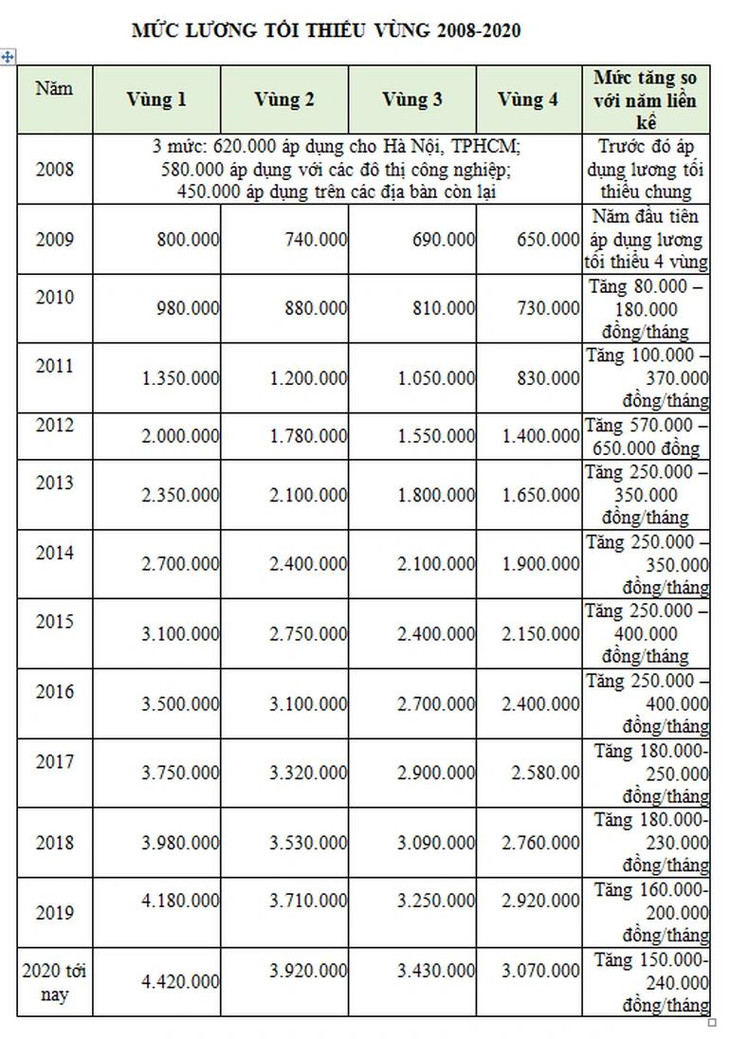 Tiền lương tối thiểu vùng hiện tại đã được duy trì hơn 2 năm qua, từ ngày 1/1/2020, với 4 vùng, vùng I là 4,42 triệu đồng; vùng II là 3,92 triệu; vùng III là 3,42 triệu và vùng IV là 3,07 triệu đồng. Lộ trình cải cách tiền lương đã tạm lùi 2 năm qua do tình hình khó khăn chung với nền kinh tế do Covid-19, để giảm thiểu gánh nặng đối với người sử dụng lao động trong bối cảnh gần như "tê liệt" vì dịch bệnh.