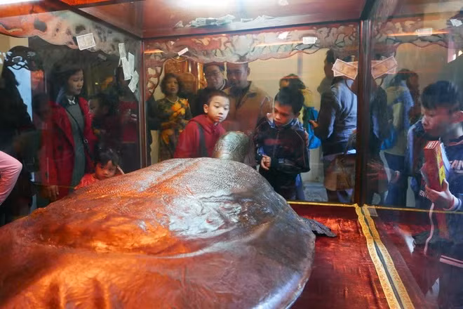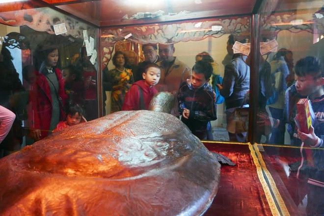 Người đi lễ đền Ngọc Sơn không quên ghé vào viếng thăm tiêu bản rùa hồ Gươm. Ngoài lý do thời tiết đẹp, nhân viên trông coi đền cho rằng việc con rùa hồ Gươm chết trước Tết cũng là lý do khiến số lượng người đến lễ đền ngày mùng 1 đột biến so với mọi năm.