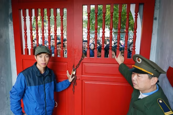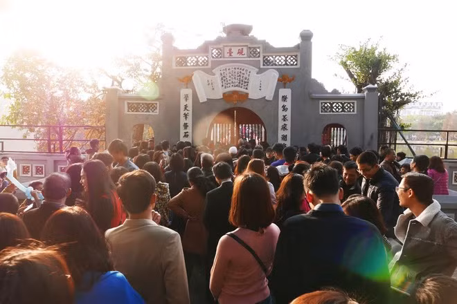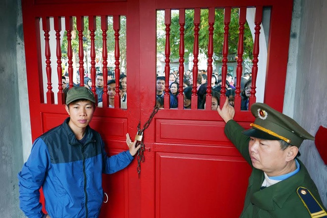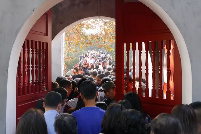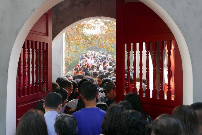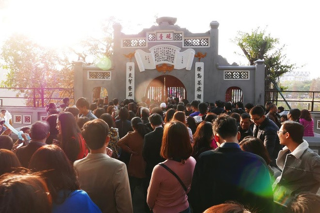 Do lượng người đến lễ quá đông, có lúc nhà đền phải đóng cửa chính để hạn chế người vào, chỉ mở cổng phụ cho người từ trong đi ra. Dưới cái nắng vàng ngày Tết, rất đông người dân đứng đợi trước cổng đền.