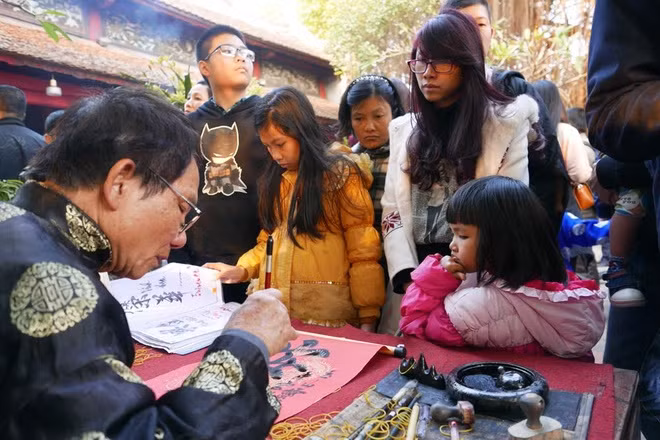 Người dân ngoài đi lễ, vãn cảnh đền cũng tranh thủ xin chữ đầu năm.