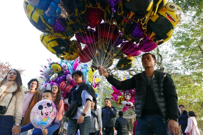 Bên ngoài đền, các dịch vụ phục vụ du khách như chụp ảnh, bán bóng bay đã hoạt động dù mới là mùng 1 Tết. Lượng người đổ về khu vực hồ Gươm cũng khá đông.
