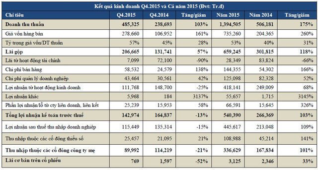 Theo báo cáo tài chính hợp nhất quý 4/2015, doanh thu thuần hợp nhất của Công ty Cổ phần Dịch vụ và Xây dựng Địa ốc Đất Xanh (mã chứng khoán: DXG), năm 2015 đạt 1.394 tỷ đồng, tăng 175% so với năm 2014, lợi nhuận sau thuế hợp nhất đạt 336 tỷ đồng, tăng 101% so với năm 2014.
