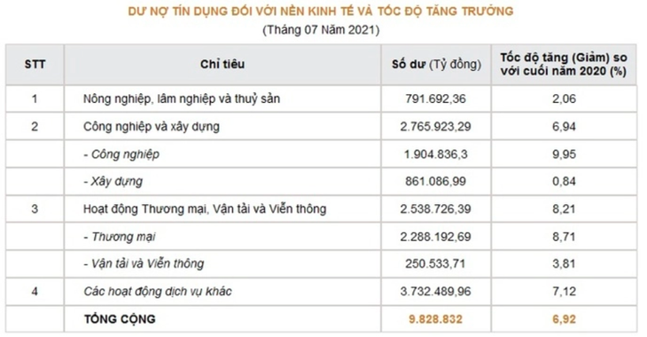 Cụ thể, dư nợ ngành công nghiệp tăng cao nhất với 9,95%. Tiếp đó là ngành thương mại với 8,71%, các hoạt động dịch vụ khác với 7,12%. Dư nợ ngành vận tải và viễn thông tăng khá khiêm tốn, chỉ 3,81%; kế đó là nông, lâm, thủy sản với 2,06%. Ngành xây dựng tăng rất thấp, chỉ 0,84%.
