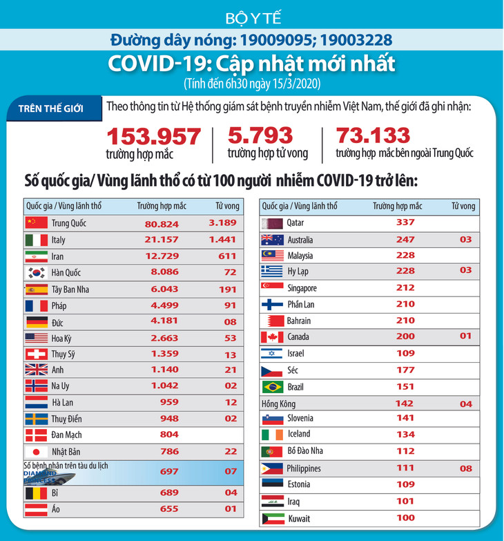Thế giới: 153.957 người mắc, 5793 người tử vong, trong đó: