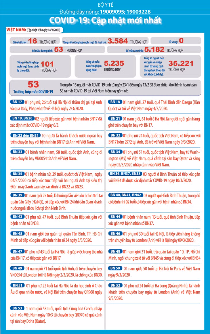 * 01 nam giới 53 tuổi, quốc tịch Cộng hoà Czech, nhập cảnh vào Việt Nam ngày 10/3 từ chuyến bay QR970 có quá cảnh tại sân bay Doha (Qatar). (BN53)