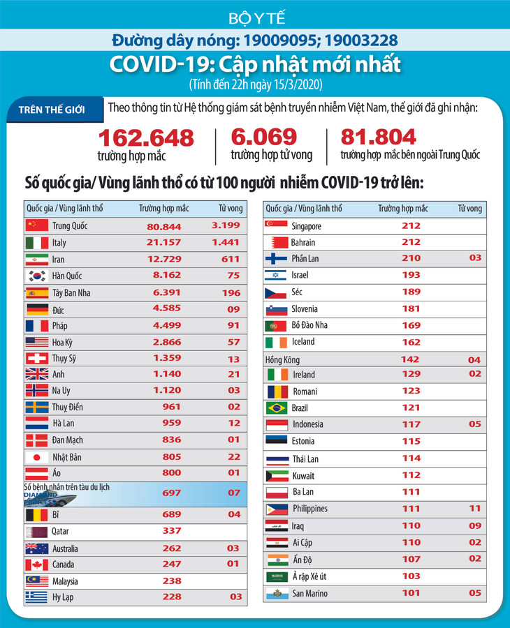 Thế giới: 162.648 người mắc, 6.069 người tử vong, trong đó: