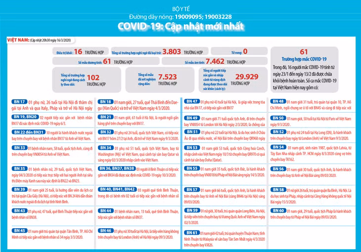 - 01 nữ giới, 30 tuổi, trú quán quận Long Biên, Hà Nội, là tiếp viên trên chuyến bay từ Vương Quốc Anh về Việt Nam ngày 02/3/2020 (BN59).