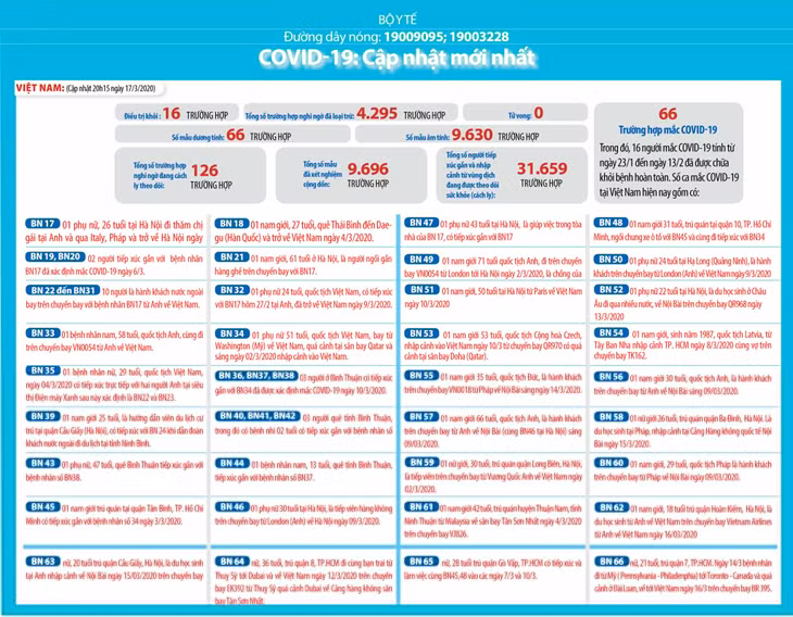 - 01 nam giới, 18 tuổi trú quận Hoàn Kiếm, Hà Nội, là du học sinh từ Anh về Việt Nam trên chuyến bay Vietnam Airlines từ Anh về Việt Nam ngày 16/03/2020 (BN62).