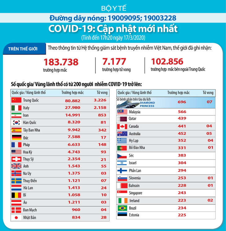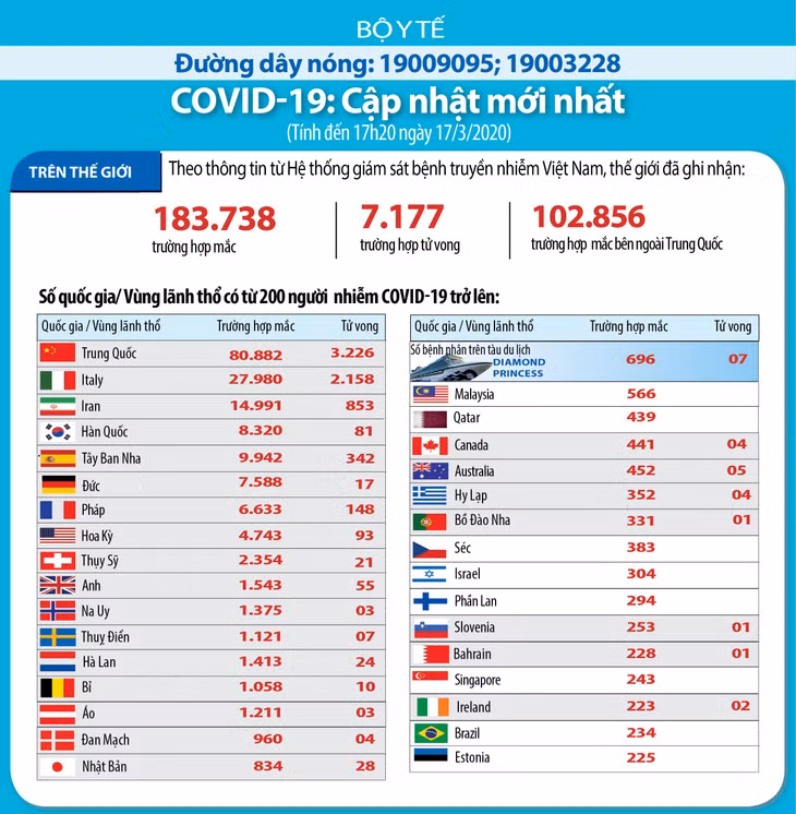 Thế giới: 183.738 người mắc, 7.177 người tử vong, trong đó:
