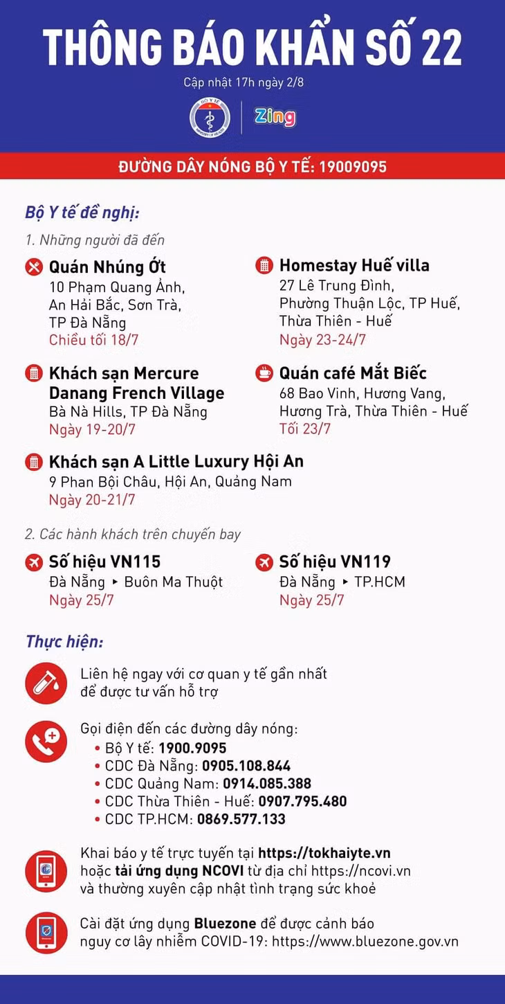 Bộ Y tế đề nghị tất cả những người trên cần liên hệ ngay với cơ quan y tế gần nhất để được tư vấn hỗ trợ. Họ cũng cần gọi điện đến các đường dây nóng cung cấp số điện thoại những người đã tiếp xúc gần với mình: 1900.9095 (Bộ Y tế), 0905.108.844 (Trung tâm Kiểm soát Bệnh tật Thành phố Đà Nẵng), 0914.085.388 (Trung tâm Kiểm soát bệnh tật tỉnh Quảng Nam) và 0869.577.133 (Trung tâm Kiểm soát bệnh tật TP Hồ Chí Minh), 0907.795.480 (Trung tâm Kiểm soát bệnh tật Thừa Thiên - Huế).