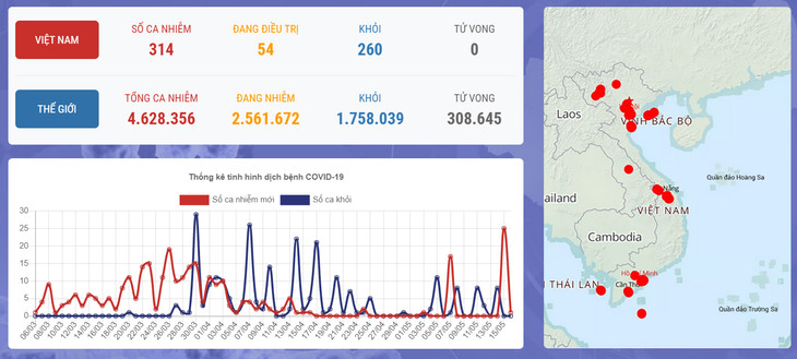 6h ngày 16/5 của Ban Chỉ đạo Quốc gia Phòng chống dịch COVID-19 cho biết đã ghi nhận thêm 1 ca mắc mới COVID-19. Đây là hành khách về nước từ Nga, đã cách ly ngay sau khi nhập cảnh. Như vậy, đến thời điểm này Việt Nam có 314 ca bệnh. Hôm nay, Việt Nam cũng bước sang thứ 30 không có ca mắc mới do lây nhiễm trong cộng đồng
