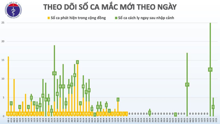 - Tính từ 6h ngày 16/4 đến 6h ngày 17/5: Đến nay Việt Nam đã bước đầu bảo vệ thành quả 31 ngày Việt Nam không có ca lây nhiễm trong cộng đồng.